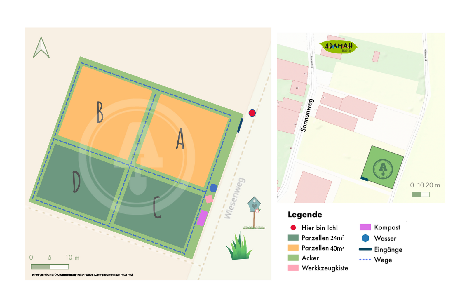 • Gartengröße 24qm (2 x 12m) oder 40 qm (2 x 20 m) - Boden vorbereitet und nach Biorichtlinien bewirtschaftet